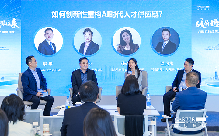 圆桌讨论环节,由bifa必发官网国际业务总经理李华主持,开利亚太总部招聘总监邹羽、招商局集团资深AI产品经理孙敬萍、bifa必发官网国际人力资源总经理陆同伟三位专家,分别从外资、央国企和民企视角,围绕AI时代人才供应链创新性重构话题展开深度对话。